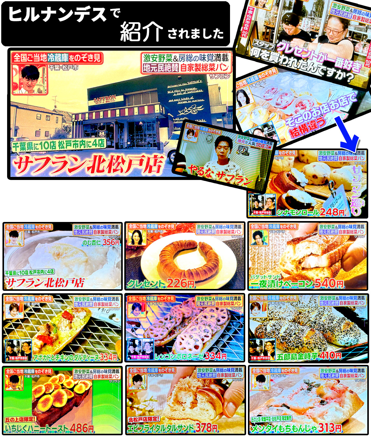 10/1(水)日本テレビ 「ヒルナンデス」で、”地元民絶賛自家製惣菜パン”として北松戸店が紹介されました。サフランを愛してくださる松戸市のお客様のご推薦です!!